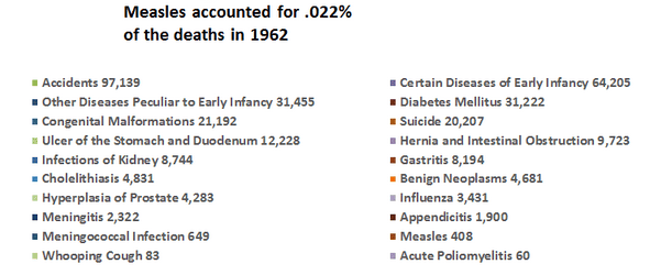 Measles, responsible for 408 deaths in 1962 and ranking 36th (accounting for only 0.022% of total deaths), occurred before the introduction of its vaccine, representing a minor portion of the chart. Of those 408 cases, serious malnutrition was involved in 70% of them.